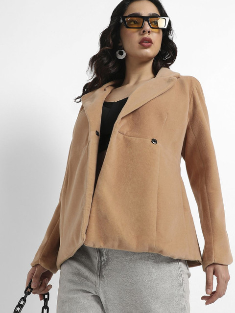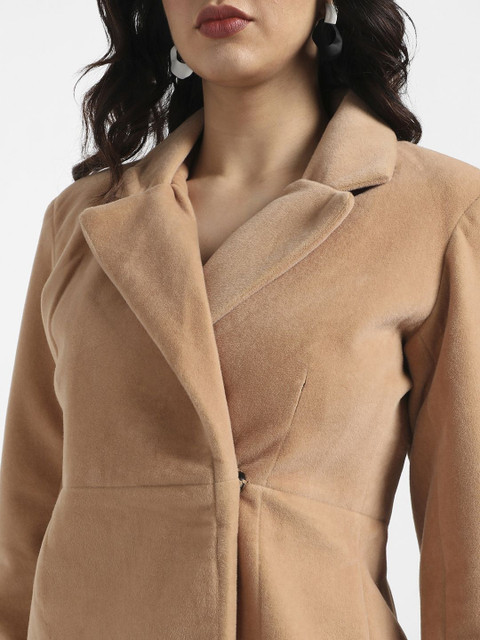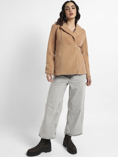 Beige solid slim-fit smart-casual blazer, has a notched lapel, long sleeves, single-breasted with double button closure, two flap pockets, one welt pocket and a single-vented back hem