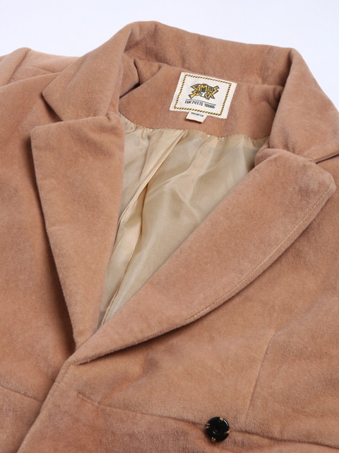 Beige solid comfort-fit casual blazer, has a notched lapel, single-breasted with button closure, long sleeves, two flap pockets, an attached lining, and a vented back hem