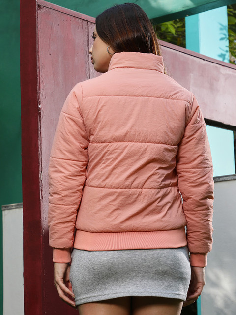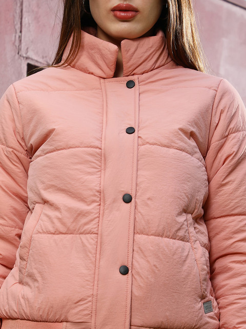 Pink solid lightweight puffer jacket with faux fur trim, has a hooded, 2 pockets ,has a button closure, long sleeves, straight hemline, without lining