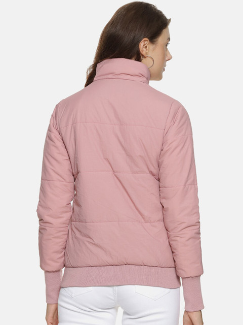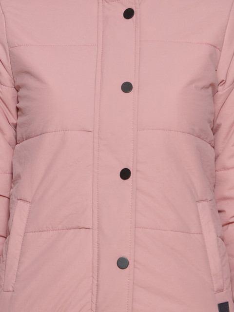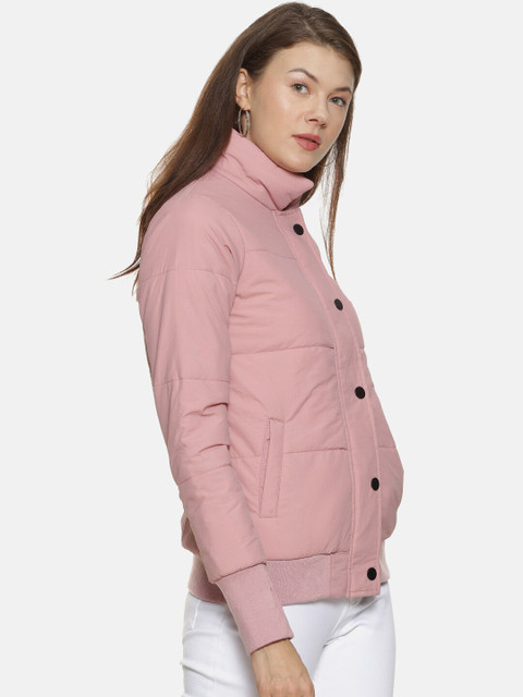 Pink solid printed windcheater bomber with shoulder tabs, has a lapel collar, 2 pockets ,has a snap button closure, long sleeves, straight hemline, polyester lining