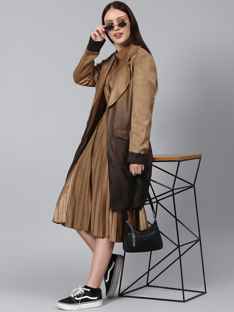 Tan brown solid single-breasted overcoat, has a notched lapel collar, long sleeves, two flap pockets, an attached lining