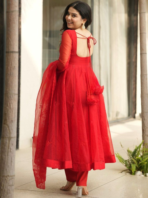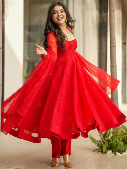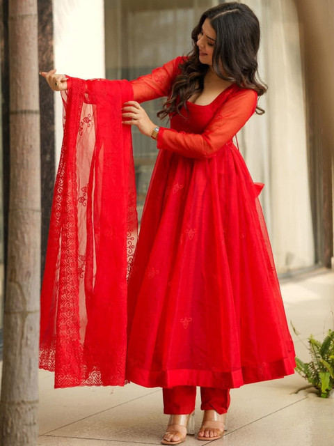 Red solid Kurta with Trousers with dupatta
