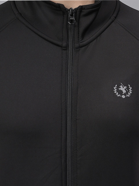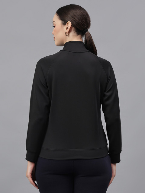 Black solid puffer jacket with zip detail, has a mock collar, 2 pockets ,has a zip closure, long sleeves, straight hemline, polyester lining