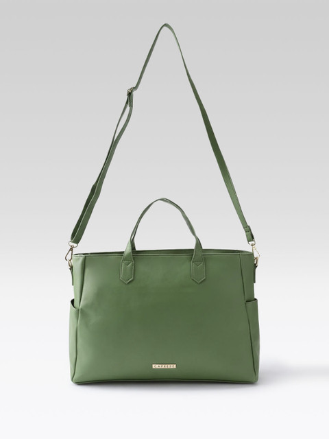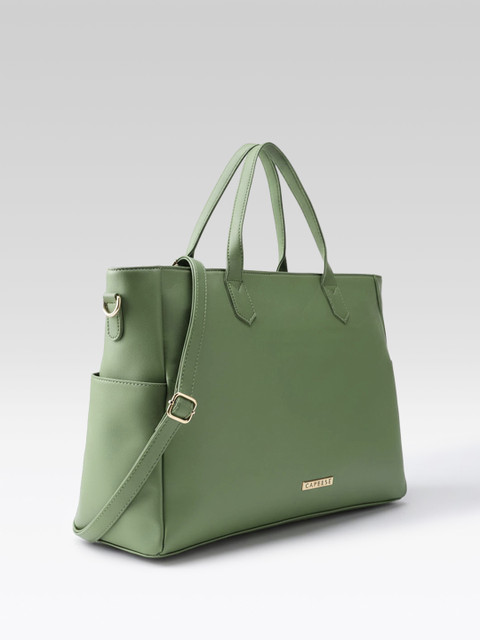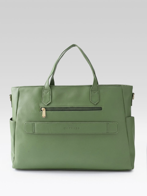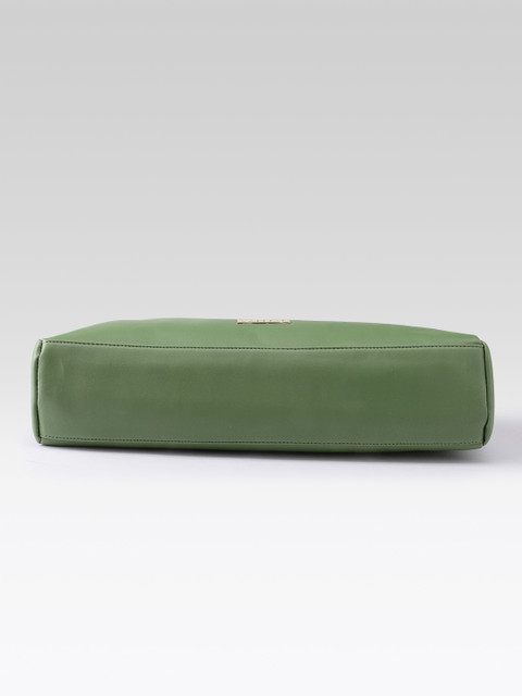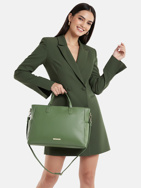 Green solid handheld bag 1 main compartment, has a zip closure, 3 external pockets, 2 inner pockets