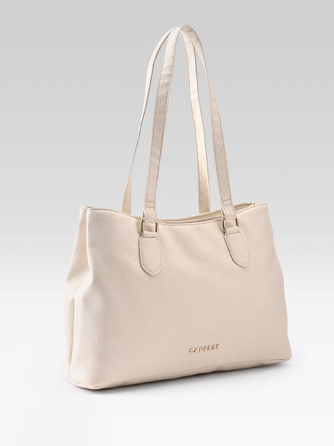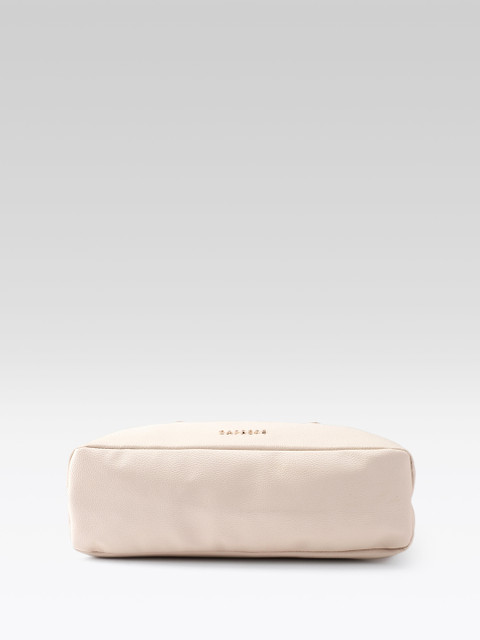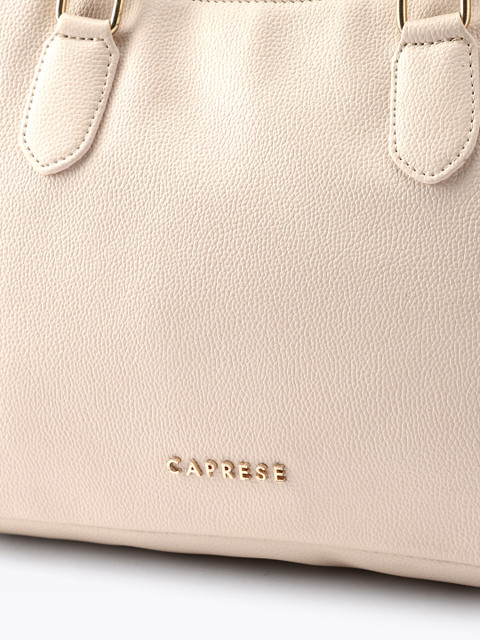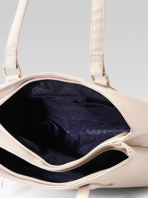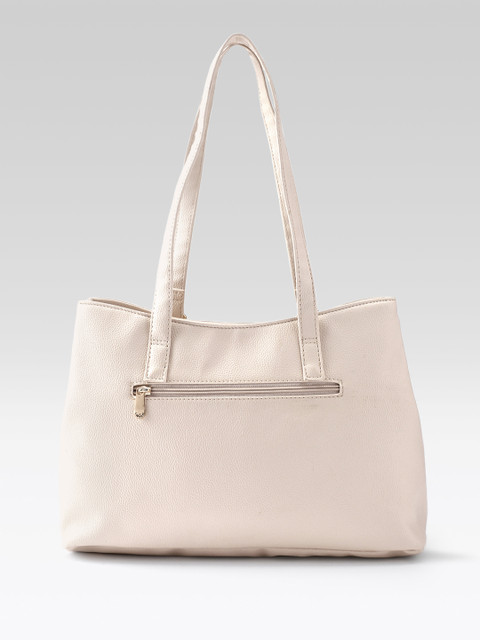 Beige textured shoulder bag 2 main compartments, has a zip closure, 1 external pocket, 1 inner pocket