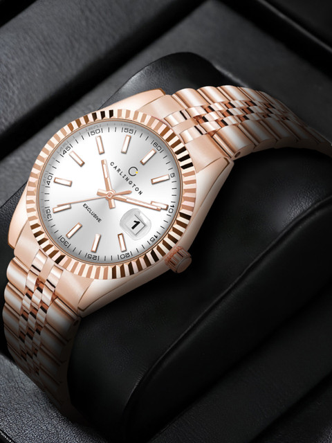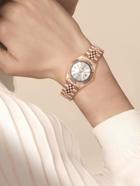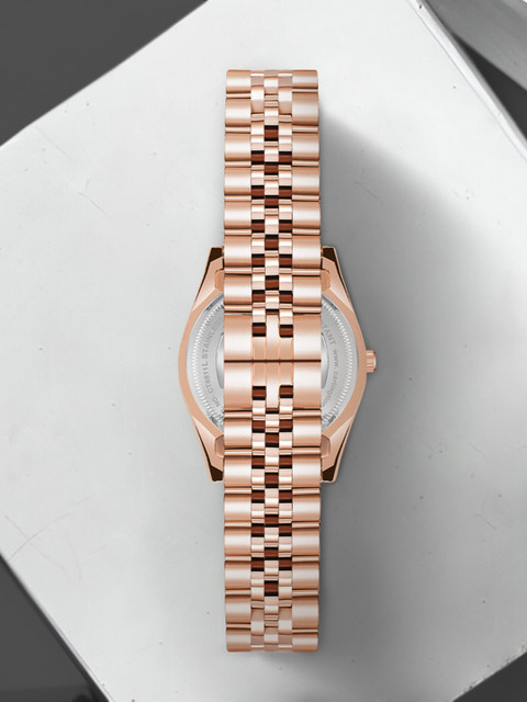 Strap Style: rose gold-plated, bracelet style, stainless steel strap with a butterfly
