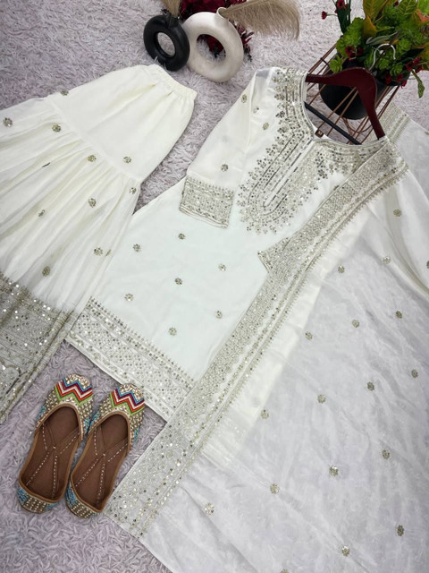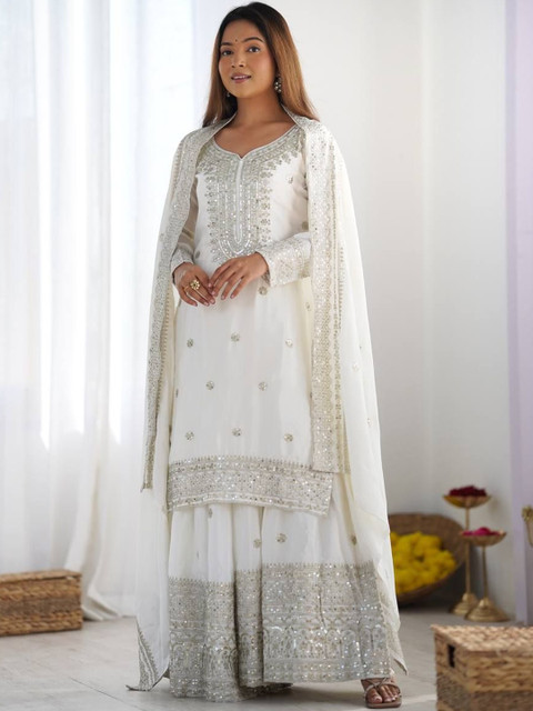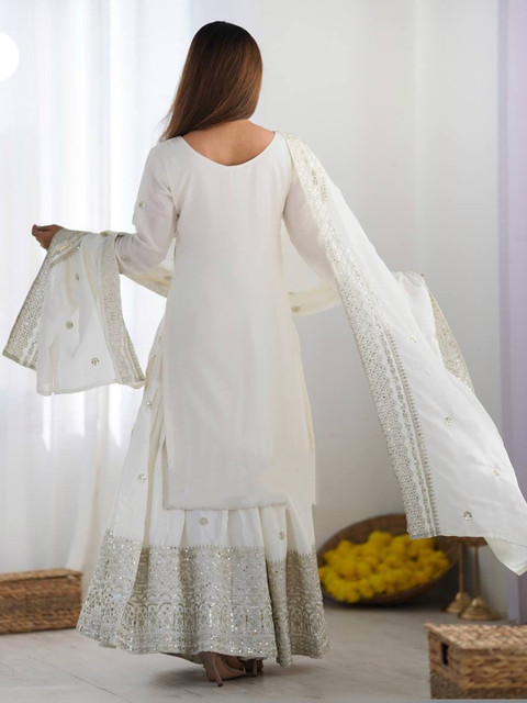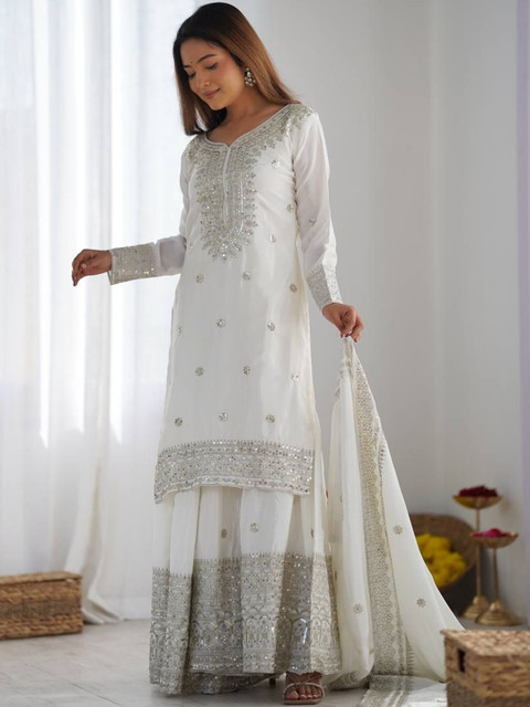 Fabric – Chinnon Featuring a beautiful embroidered pattern, this womens kurta, Sharara, and dupatta set offers an attractive, elegant aesthetic. adds a touch of sophistication, enhancing the overall appeal of the outfit