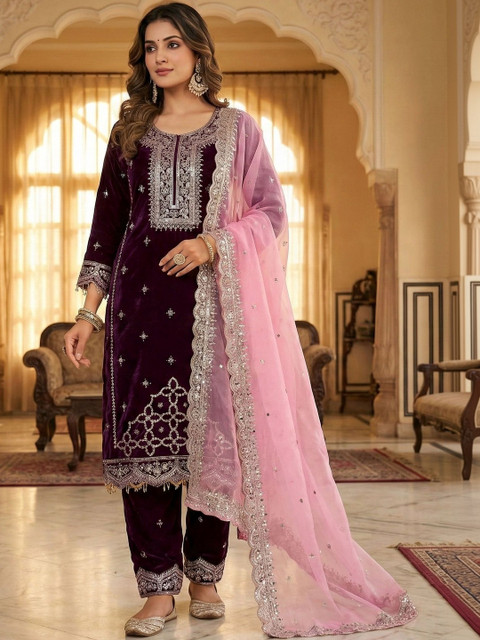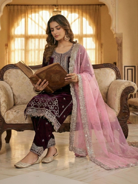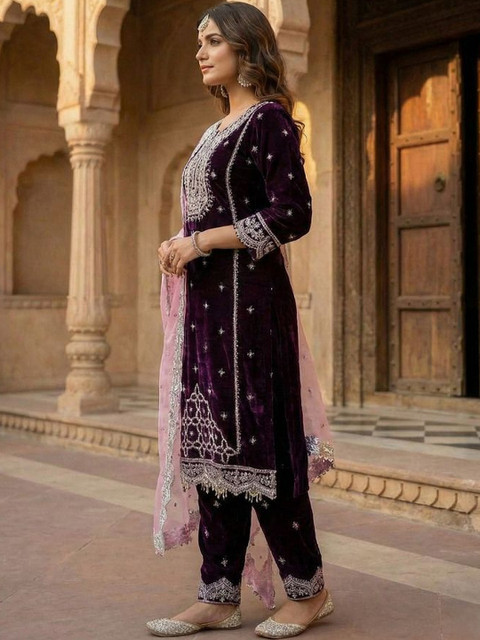 Purple coloured pure velvet kurta set with parallel and duppata , beautiful colour ,full zarii embroidery on sleeves neck nd on dupatta nd at parallel, full streachable nd comfortable ,fabric quality is awsm. Awsm fit , must buy