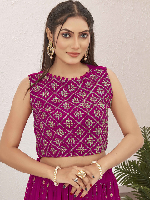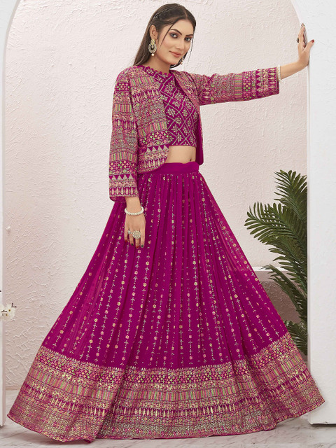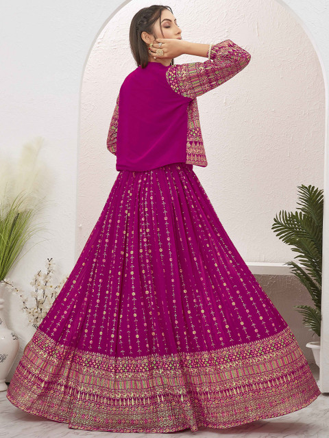 Pink Blooming Georgette Foil print Lehenga with Jari Embroidery worked Blooming Georgette Choli and foil print Blooming Georgette Jacket.Ready to wear choli has a Boat Neck, Sleeveless, Zip Closure.Ready to wear lehenga has Drawstring and Zip Closure.Ready to wear Jacket has Three Quarter Regular Sleeves.