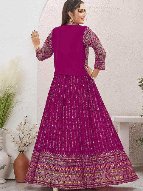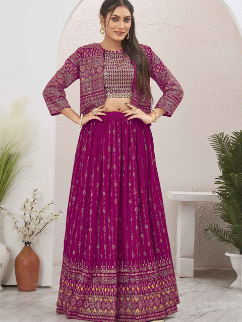 Pink Blooming Georgette Foil print Lehenga with Jari Embroidery worked Blooming Georgette Choli and foil print Blooming Georgette Jacket.Ready to wear choli has a Boat Neck, Sleeveless, Zip Closure.Ready to wear lehenga has Drawstring and Zip Closure.Ready to wear Jacket has Three Quarter Regular Sleeves.