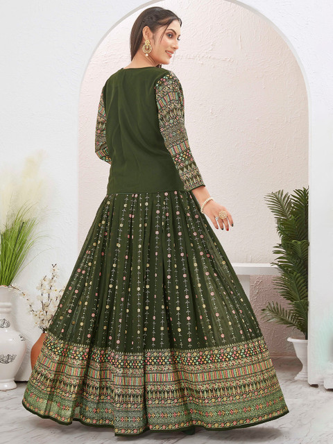 Green and gold-toned ethnic motifs embroidered ready to wear lehenga, has zip closure, flared hem