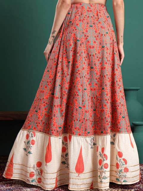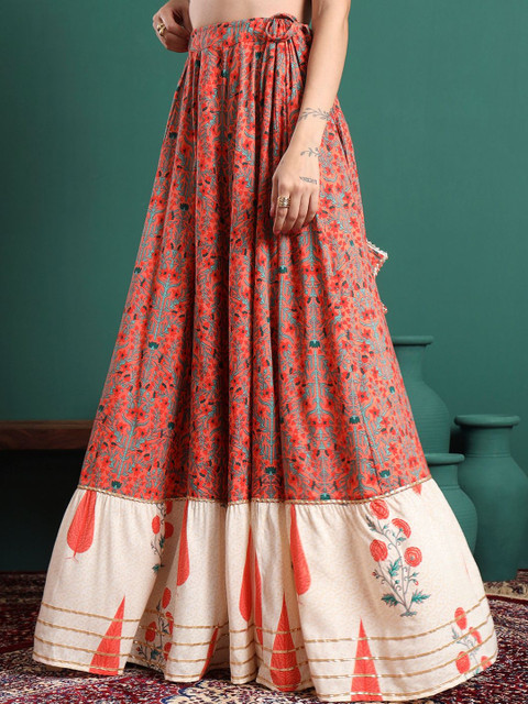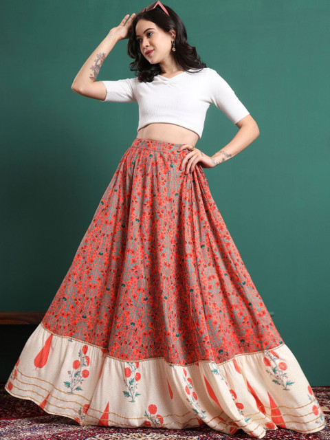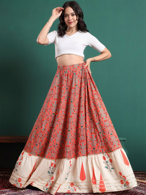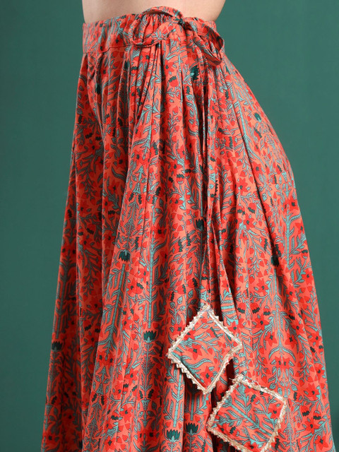 Red printed flared maxi skirt, has an elasticated waistband with drawstring closure, and a flared hemline