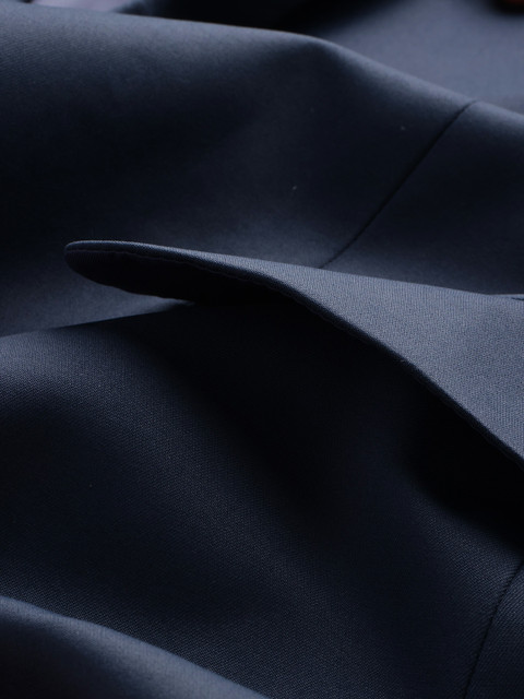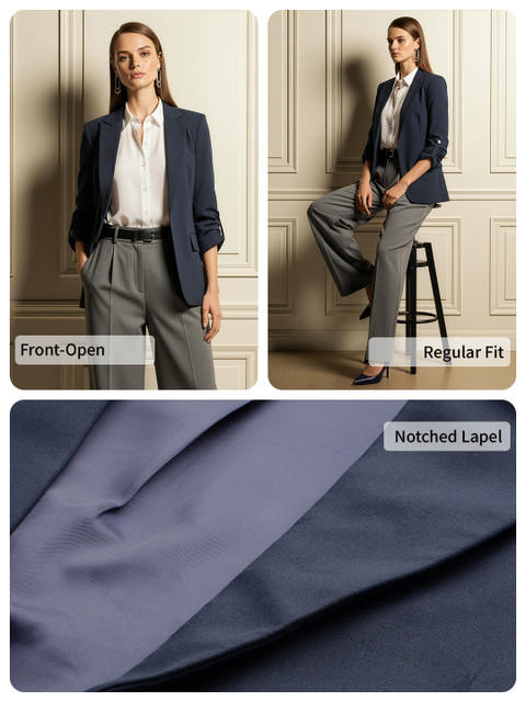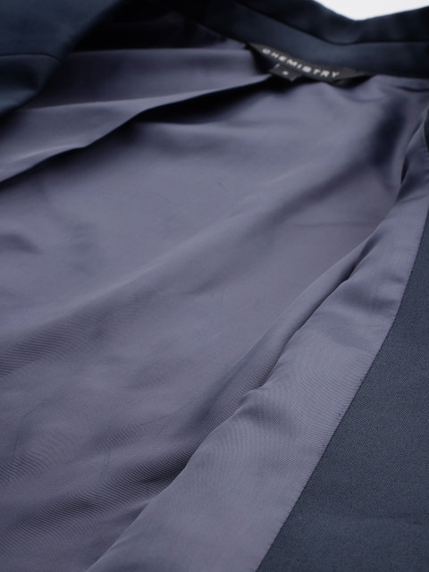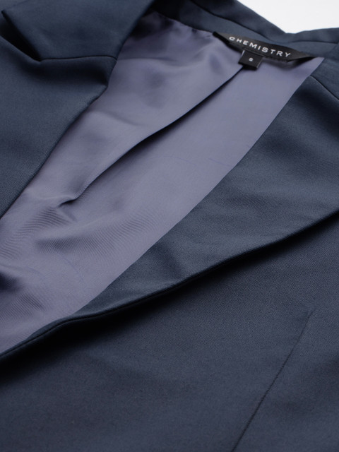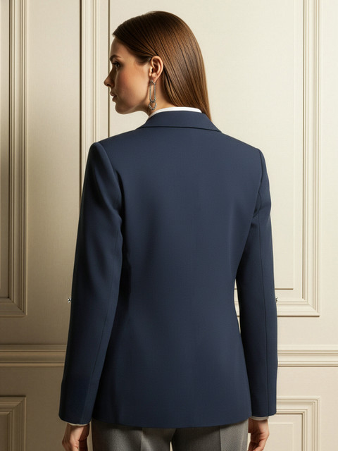 Navy blue colored  front-open blazer, has a notched lapel collar, long regular sleeves 1 insert pocket 2 flap pockets and ventless hem