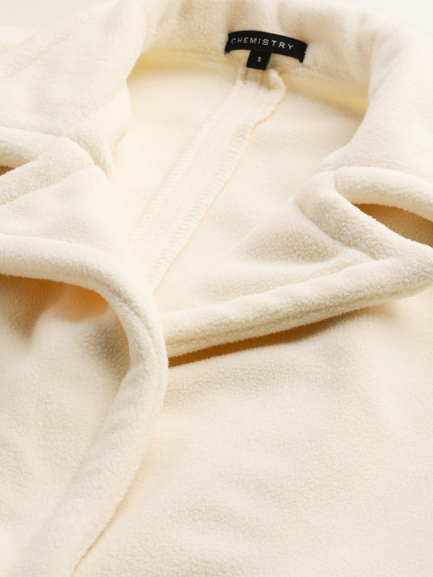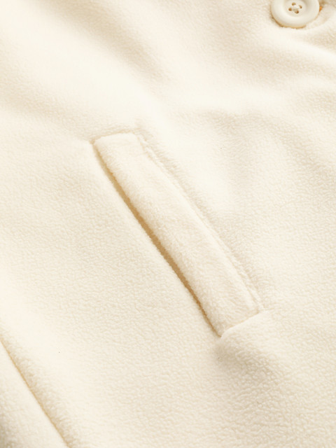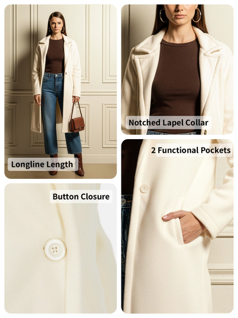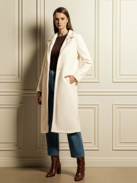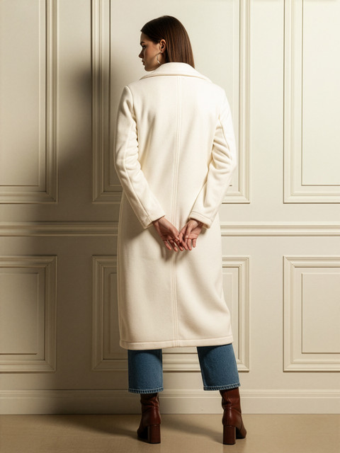 Off-white solid overcoat, single-breasted, notched lapel collar, button closure, 2 insert pockets, longline length, long, regular sleeves