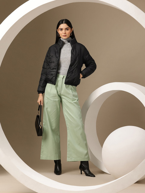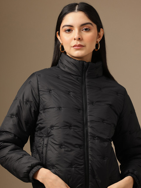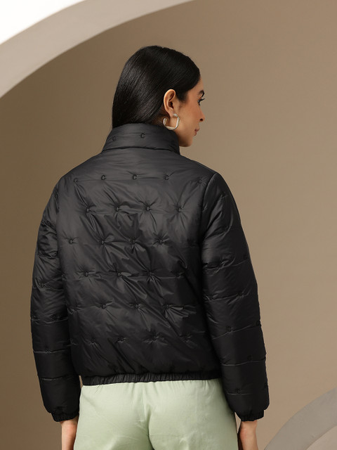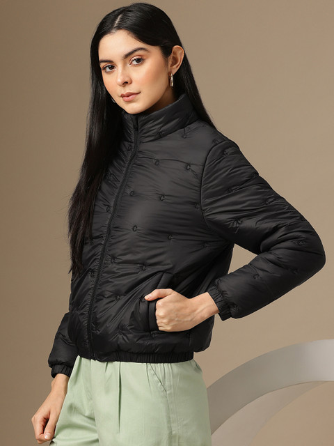 Black solid padded jacket, has a mock collar, 2 pockets, a zip closure, long sleeves, straight hemline, polyester lining