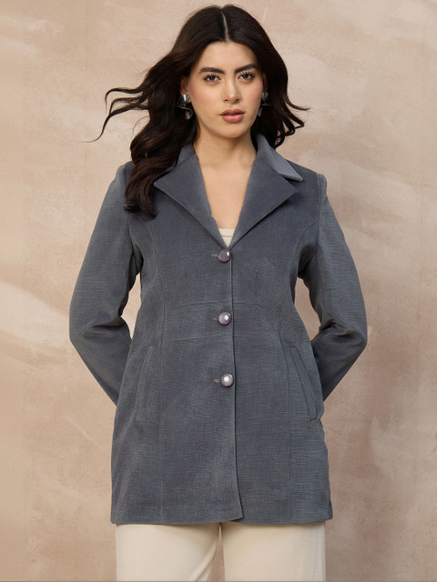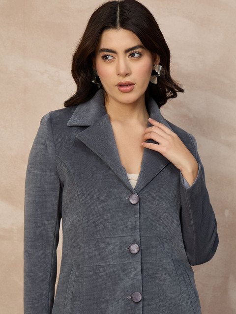 Grey self designed single-breasted overcoat, has notched lapel collar, long sleeves, button closure, two pockets, a straight hem