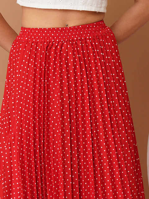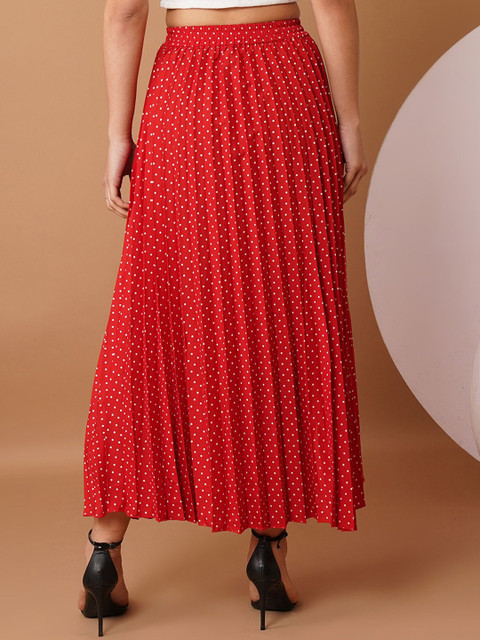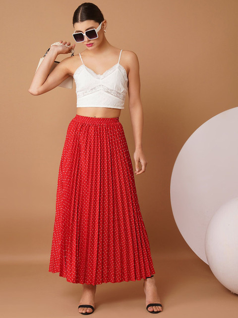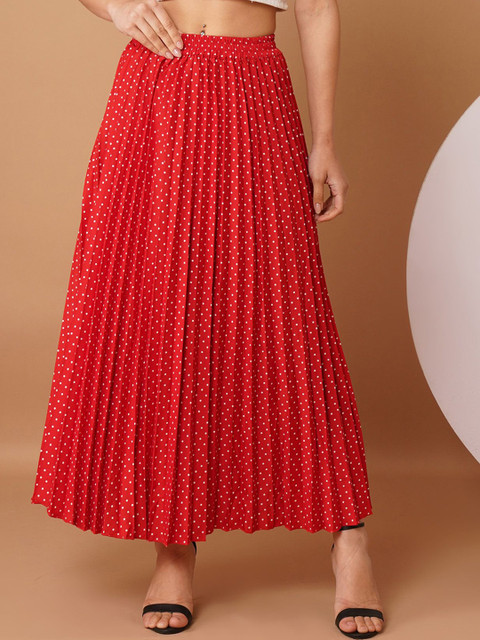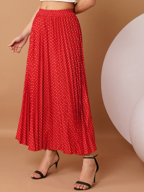 Red printed solid A-line pleated maxi skirt, has an elasticated waistband with slip-on closure, and a flared hem