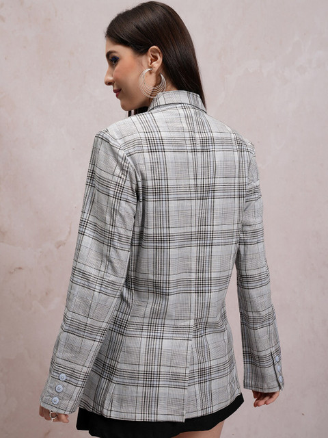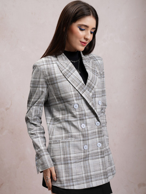 Grey Checked Regular-fit blazer, has a notched lapel, long sleeves, Double-breasted with double button closure, two flap pockets, one welt pocket and a double-vented back hem