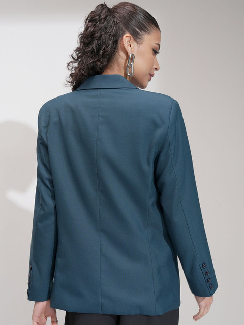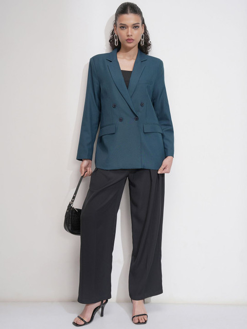 Blue and black solid regular-fit smart-casual blazer, has a notched lapel, long sleeves, double-breasted with button closure, three flap pockets and a ventless back hem