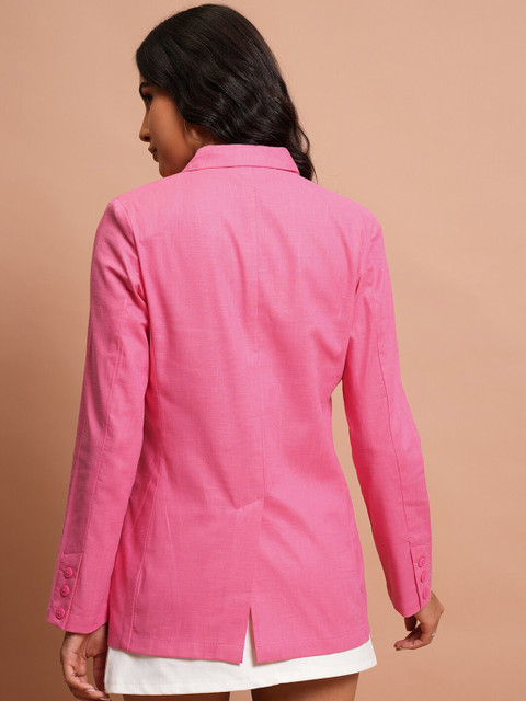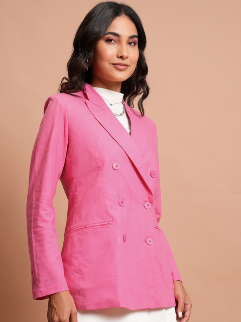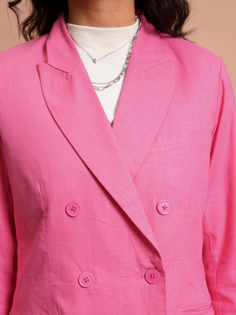 Pink solid regular-fit casual blazer, has a notched lapel, long sleeves, double-breasted with double button closure, two flap pockets, one welt pocket and a single vent back hem