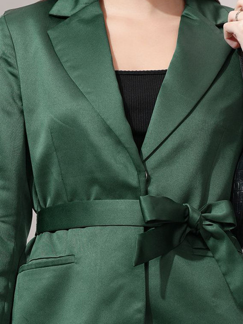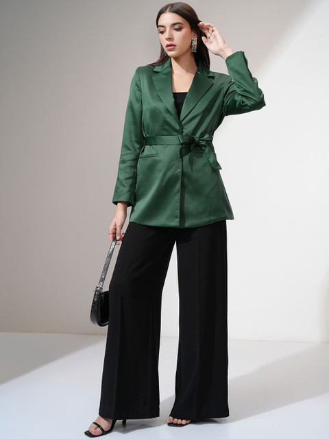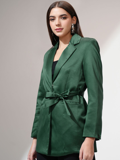 Green solid regular-fit tie up blazer, has a notched lapel, long sleeves, single-breasted with button closure, two flap pockets and a single-vented back hem