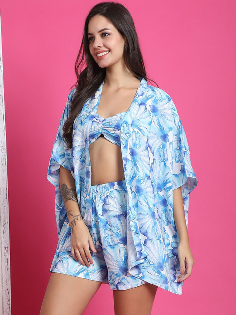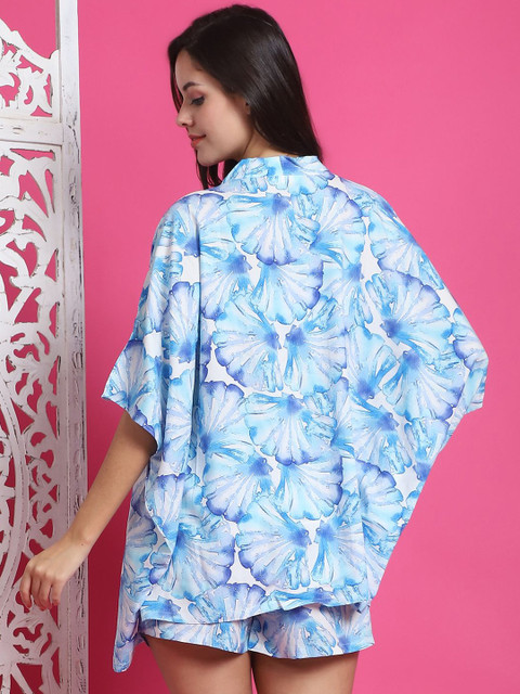 Bleu & white floral printed robe, has three quarter sleeves, slip on closure and flared hem
