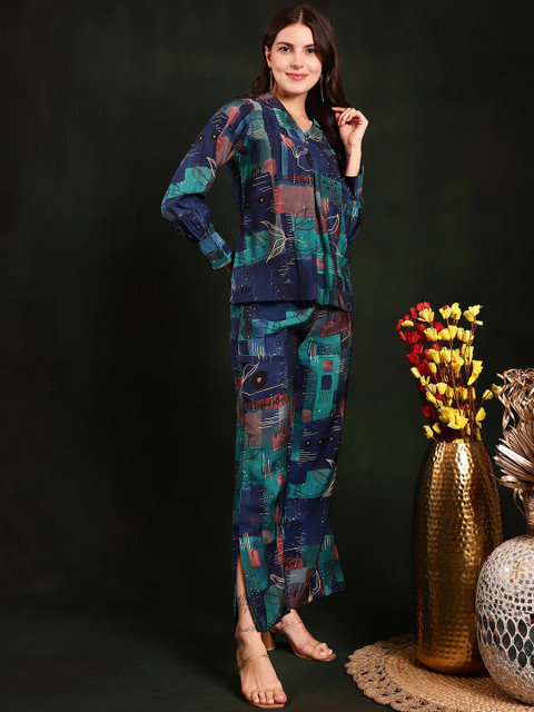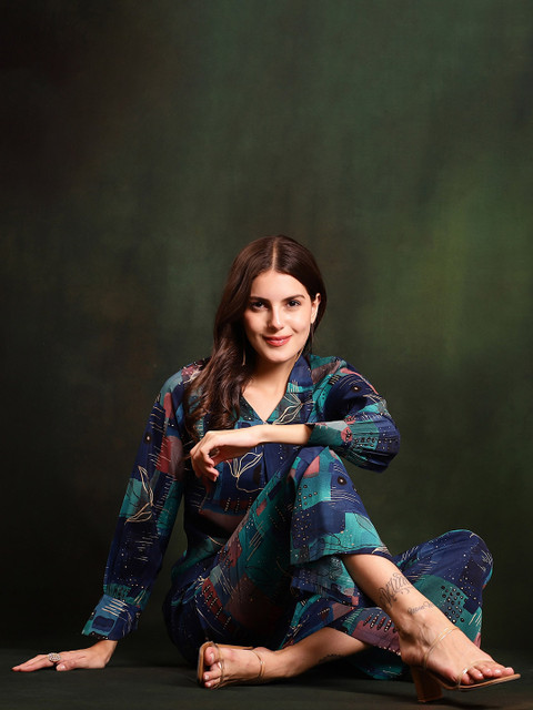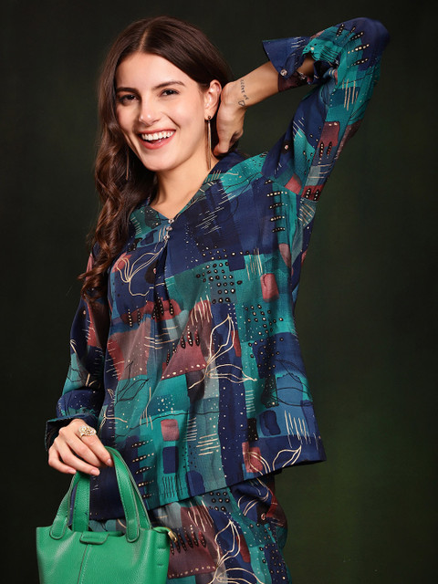 Blue floral printed tunic, has shirt collar-neck, long sleeves, pleated details, slip-on closure and flared hem