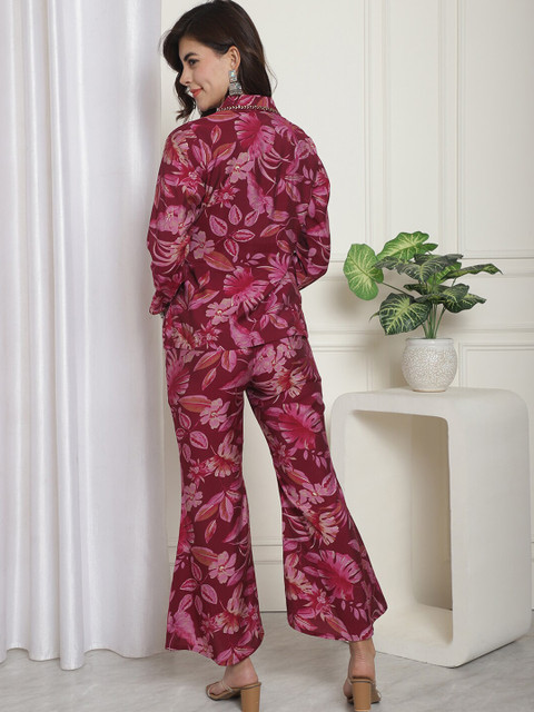 Purple printed shirt, has shawl collar, three-quarter sleeves, full placket button closure and regular waist hem