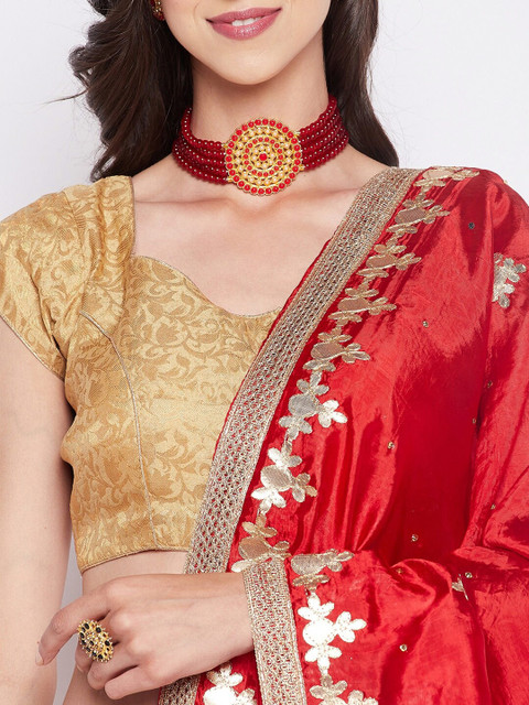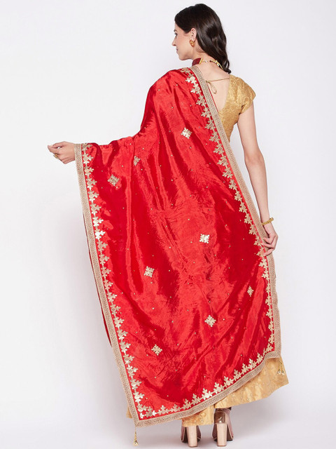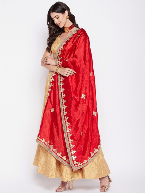 Red and gold-toned ethnic motifs embroidered dupatta gotta patti, tasselled border