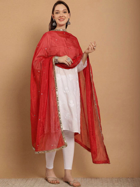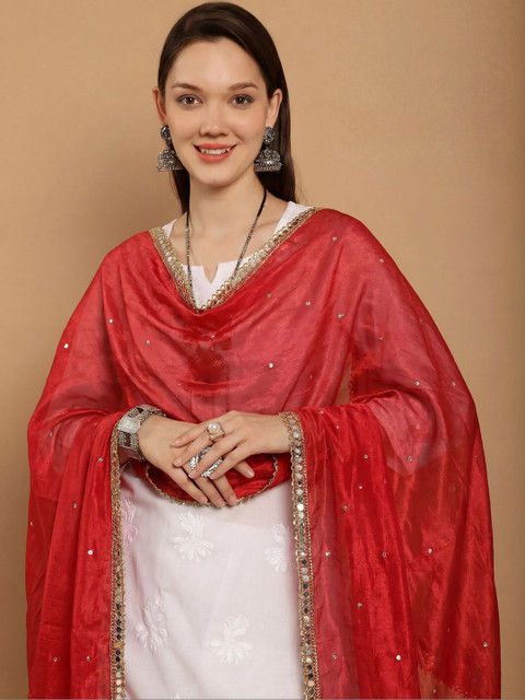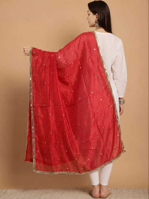 Red Ethnic Motifs Solid dupatta Mirror Work, Embellished border