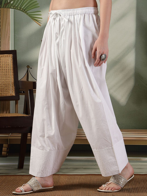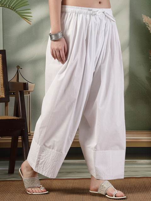 White solid loose fit cotton farshi salwar has thread work along the hem and wide bottom hole ensures ease of movement along with elasticated waistband and slip-on closure.