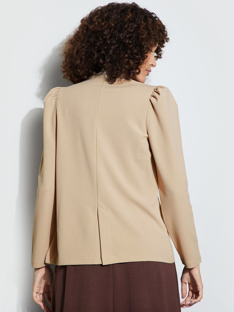 Beige Solid single-breasted blazer with a shawl collar, button closure, full puff sleeves and a back vented hem for a comfortable fit.