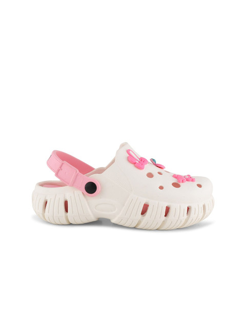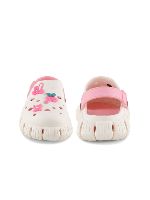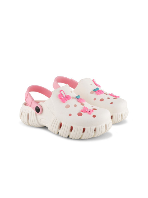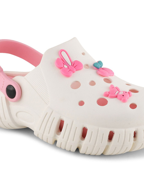 These women’s textured slip-on clogs have a casual and playful look with a white base, mint-green strap and insole, and decorative charms (hearts, bunny, teddy). The thick, patterned sole suggests decent cushioning and grip, making them practical for daily wear.
