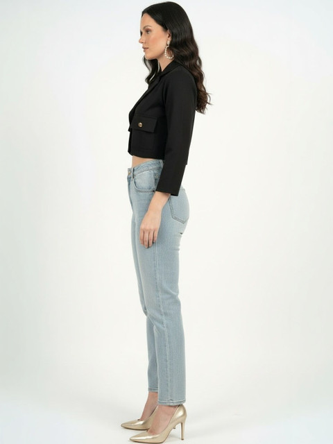 Black solid tailored-fit casual blazer, has a notched lapel, long sleeves, single-breasted with button closure, two flap pockets, one welt pocket and a ventless back hem
