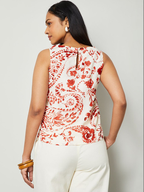 Printed top featuring a round neck, sleeveless design, and button closure.