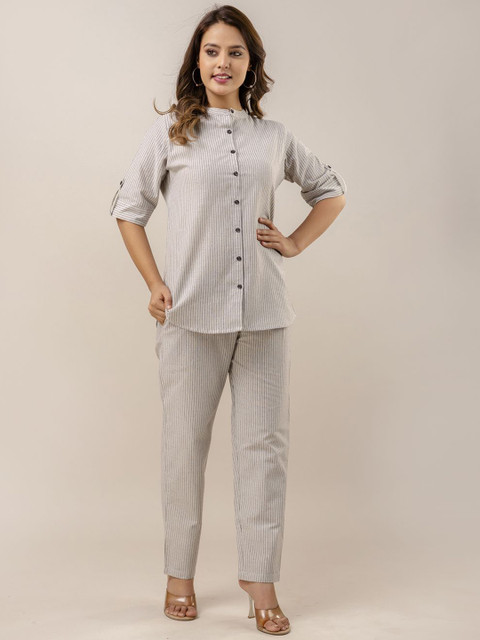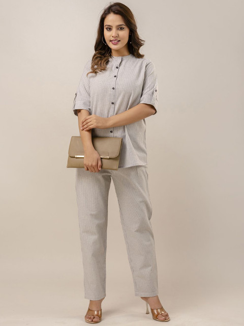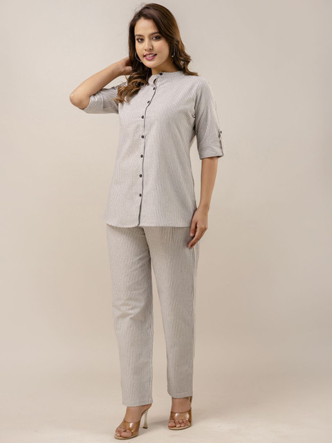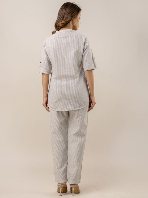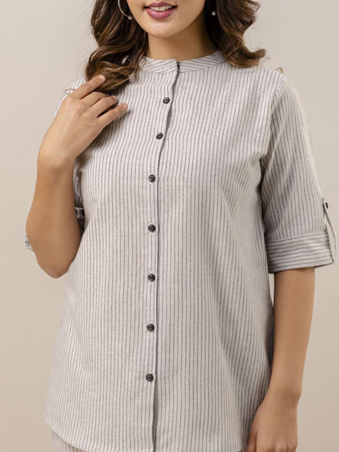 Grey and black striped tunic, has mandarin collar and three-quarter sleeves