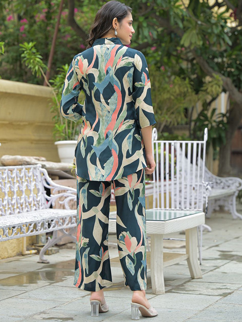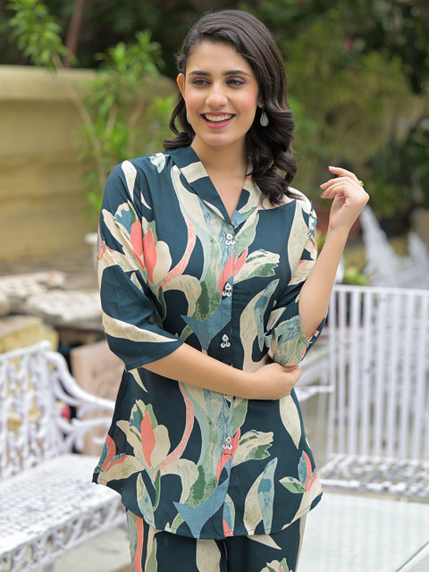 Green printed shirt, has a shirt collar neck and three quarter sleeves, secured with button closure
