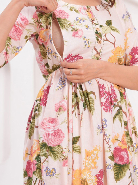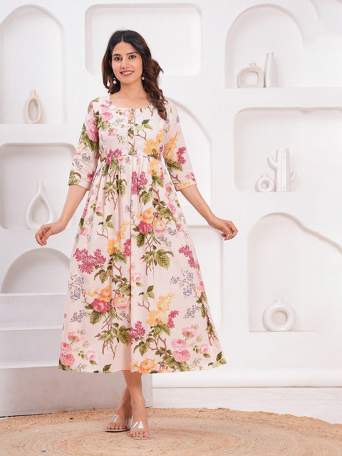 - Cream and pink coloured floral printed fit and flare dress