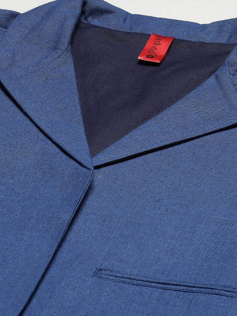 Blue solid regular-fit formal blazer, has a notched lapel collar, long sleeves, single-breasted with front open closure, 2 pockets and attached lining