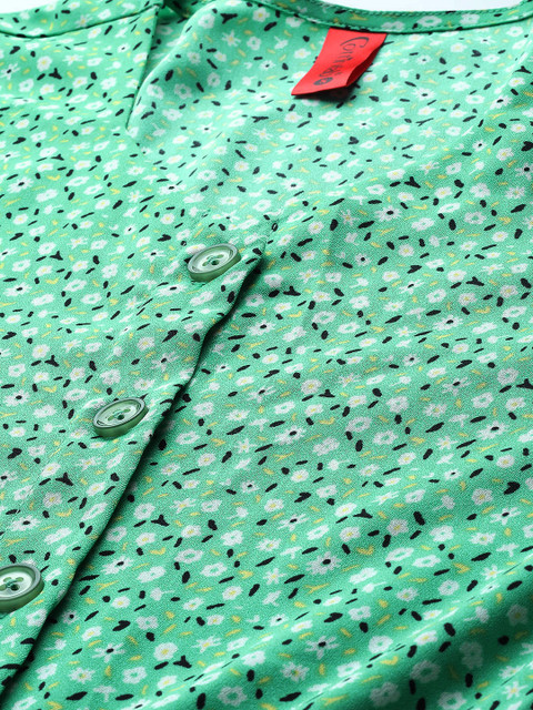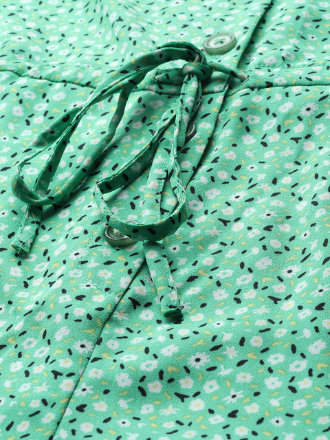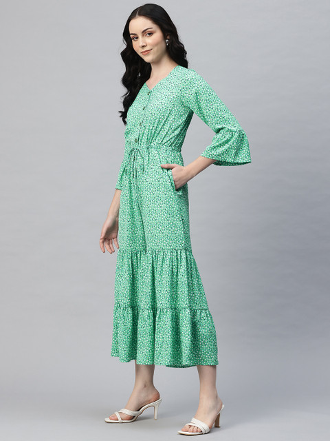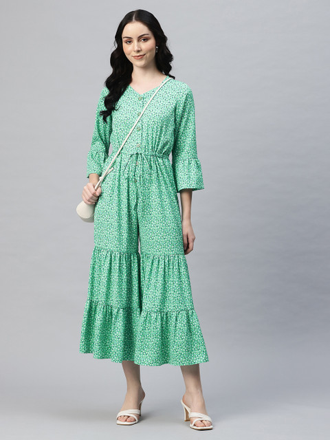 Green and white printed basic jumpsuit with gathers ,has a v-neck, three-quarter sleeves, 2 pockets