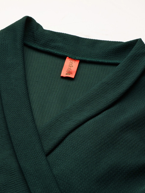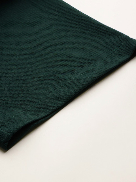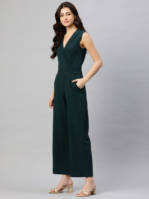 Green self design basic jumpsuit, has a shawl neck, sleeveless, 2 pockets, and concealed zip closure