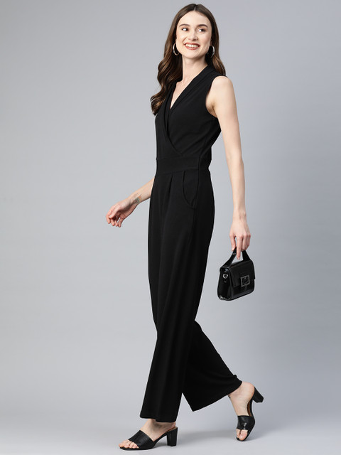 Black solid basic jumpsuit ,has a shawl neck, sleeveless, 2 pockets