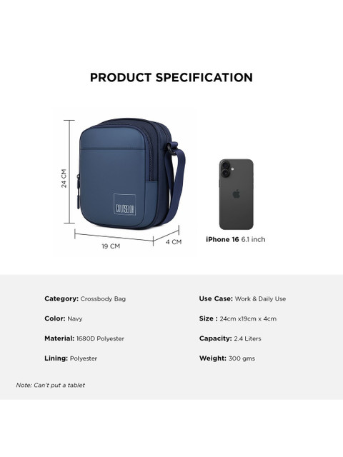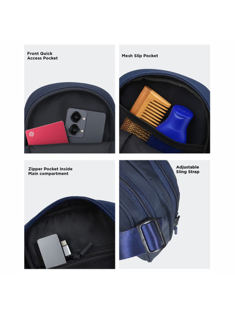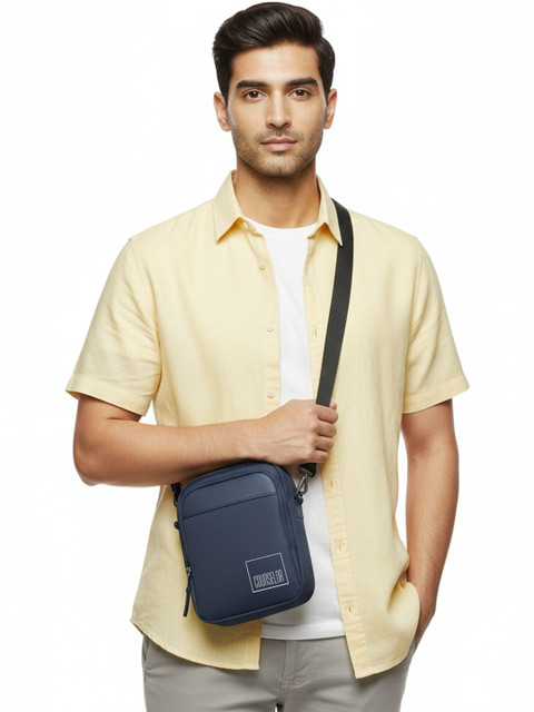 Navy blue brand logo solid sling bag 1 main compartment, has a zip closure, Tablet sleeve: no