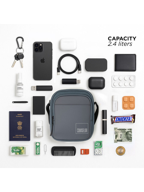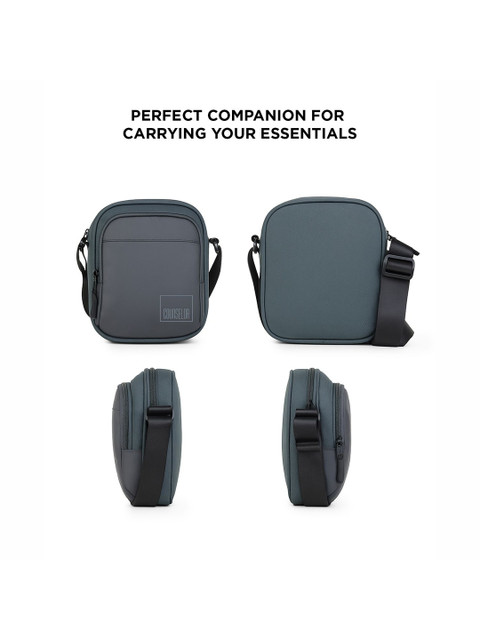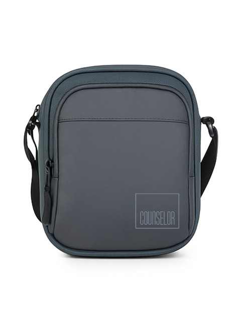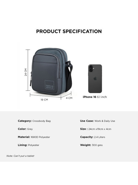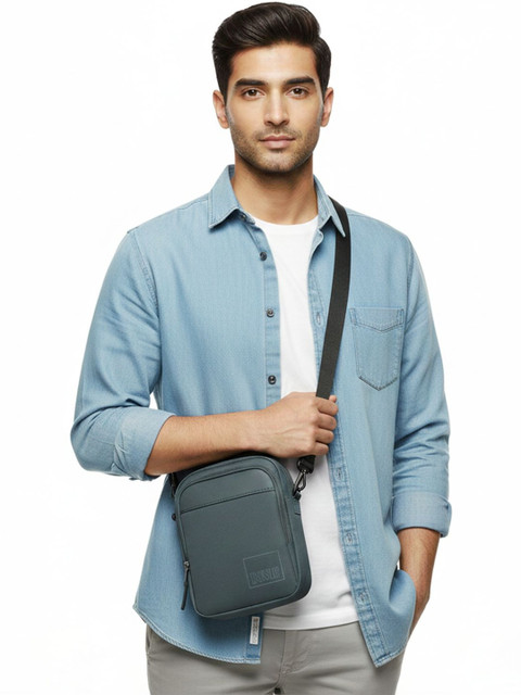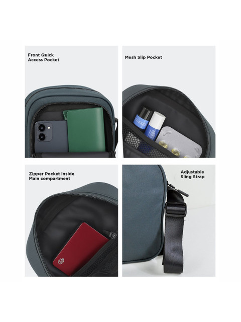 Grey brand logo solid sling bag 1 main compartment, has a zip closure, Tablet sleeve: no