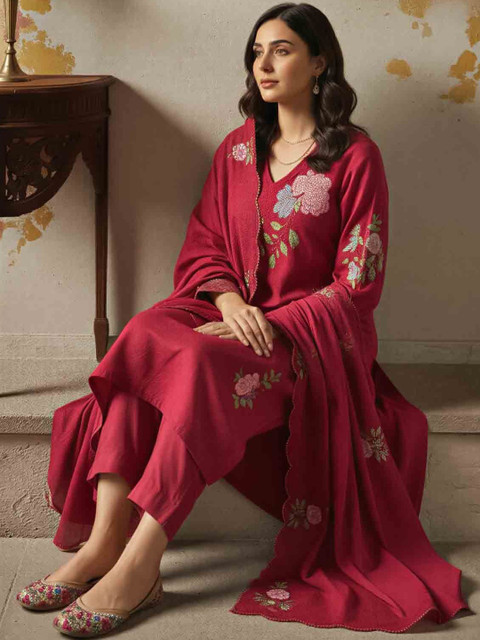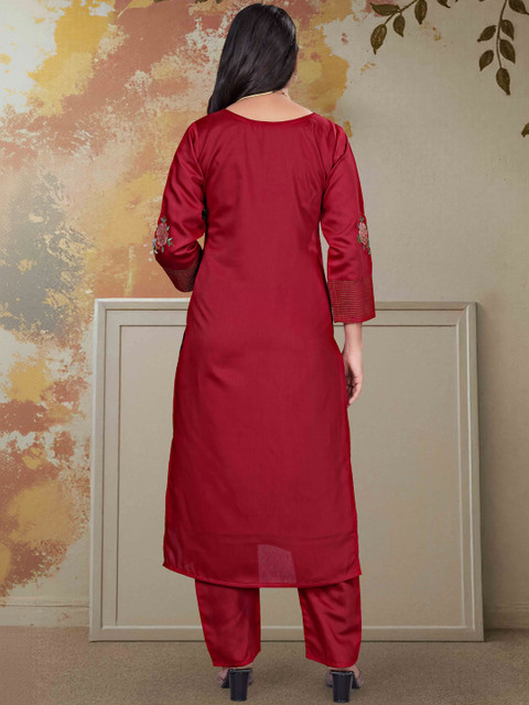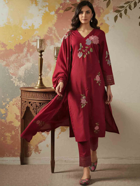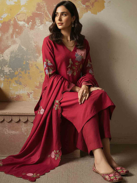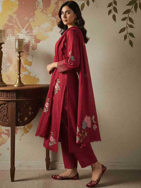 Maroon Embroidered Kurta with Trousers With Dupatta