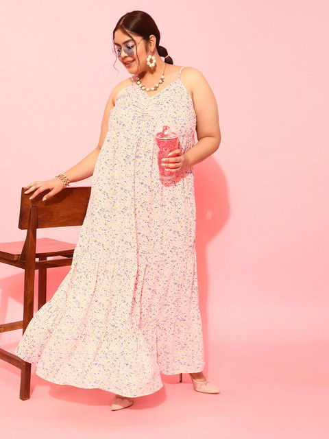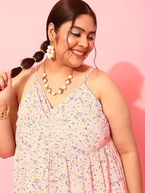 CURVY STREET Plus Size Peach-Coloured & White Floral Printed Shoulder Straps A-Line Dress