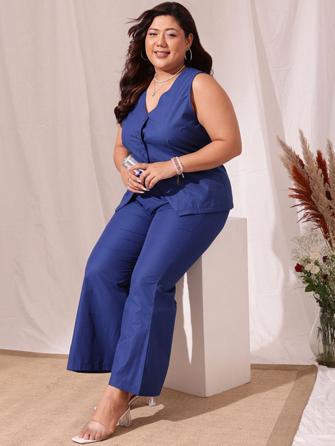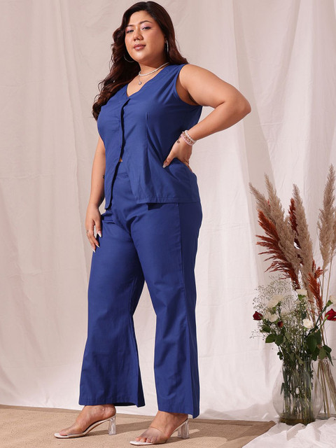 Blue solid top, has V- neck, sleeveless, button closure and regular waist hem