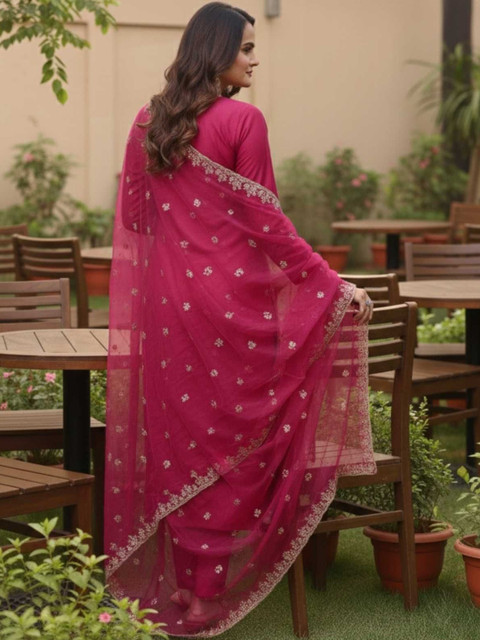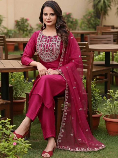 Fuchsia embroidered Kurta with Trousers with dupatta