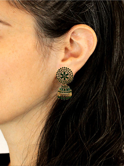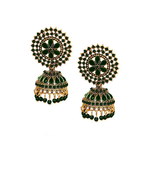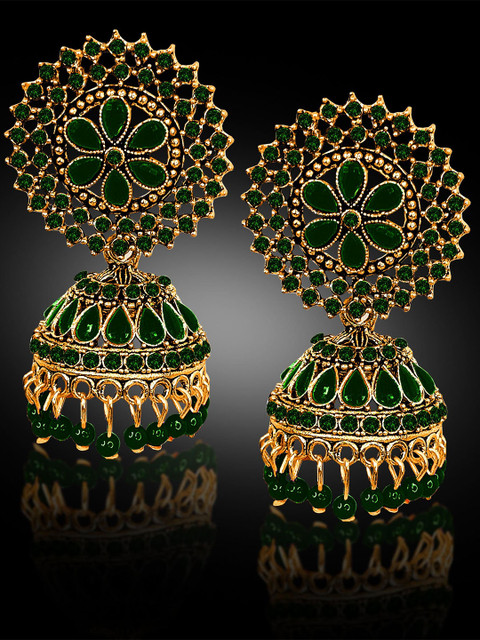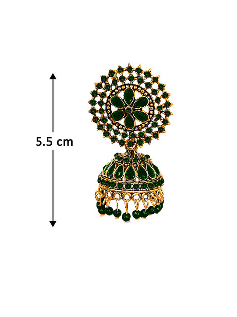 Gold-toned & green dome shaped jhumkas, gold-plated, has artificial stones studded & beaded details