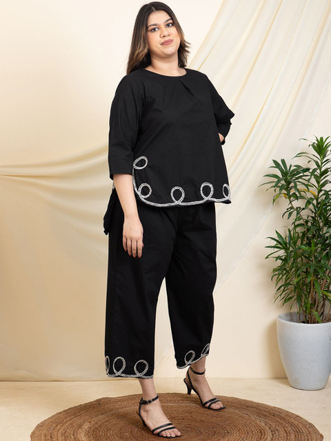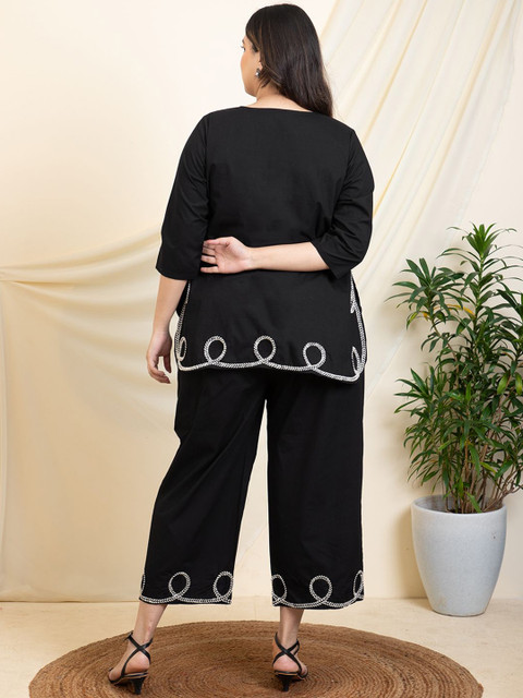 Black and white embroidered tunic, has boat neck collar, three quarter sleeves, slip-on closure regular waist hem